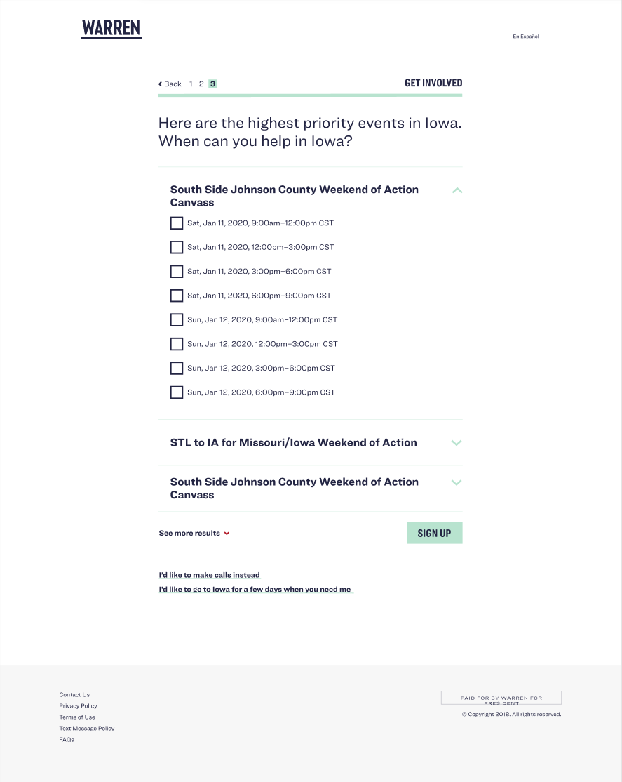 Shifter powered in-app event signups on Switchboard (above), as well as on our website. We built a beautiful personalized signup journey based on Shifter, where visitors could select how they wanted to help and we would recommend events based on their location (and the campaign’s priorities in that location). Shifter also acted as a failsafe to capture and cache event signups when Mobilize went down.